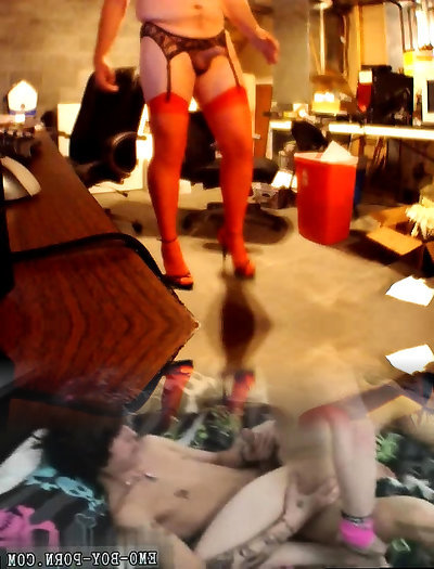 la transsexuelle maigre caresse sa grosse bite et son sac de noix
